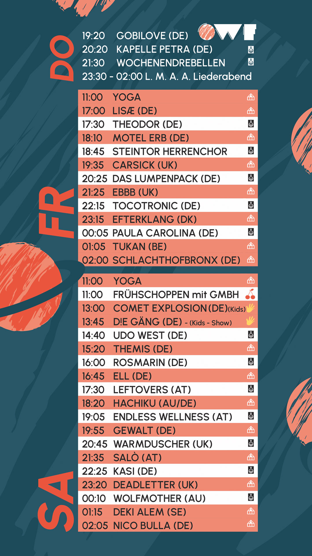 Aber das beste Festivalpublikum verdient natürlich auch ein außergewöhliches Festival. In unserer Umlaufbahn werden sich wieder alte Bekannte, Geheimtipps und Lieblingsbands tummeln.